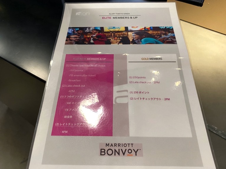 ちなみに、「アロフト東京銀座」のエリート特典は以下のようになっています。プラチナ以上のメンバーの場合は、「3つのギフトチョイス」と「レイトチェックアウト」を受けることができます。