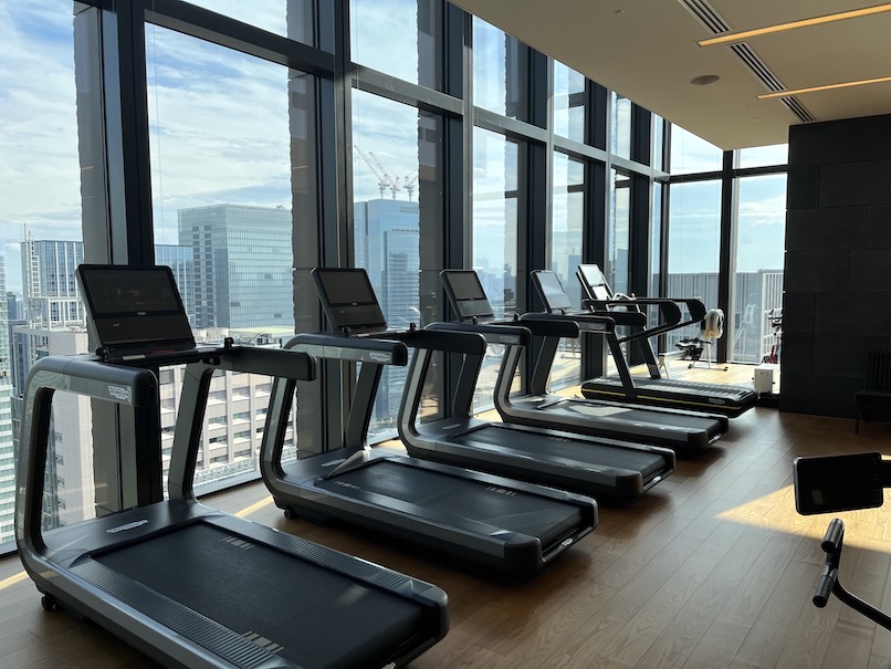 ジム(フィットネス)の全体像はこんな感じです。プールほど天井は高くはないものの、こちらも2面が窓になっており、明るい雰囲気です。