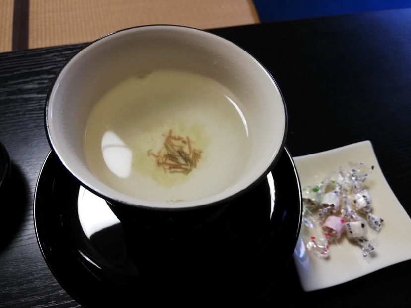 この日提供されたお茶は、温かい「こんぶ茶」でした。我々が訪れたのは11月上旬でかなり肌寒くなっていたため、温かいお茶をいただいてほっこりすることができました。