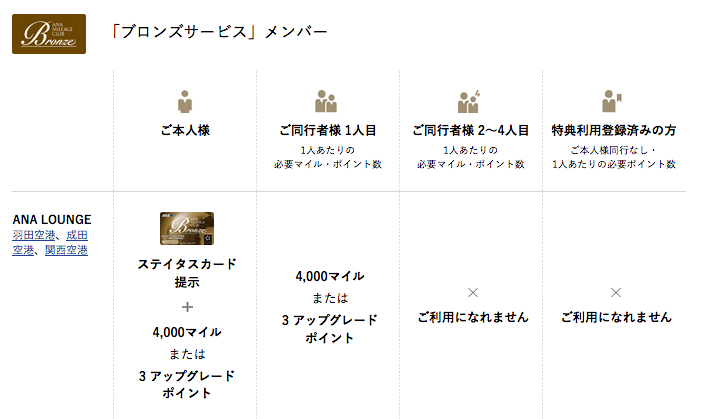 国内線のANAラウンジを利用するには、「4,000マイルまたは3アップグレードポイント」が必要となります。
