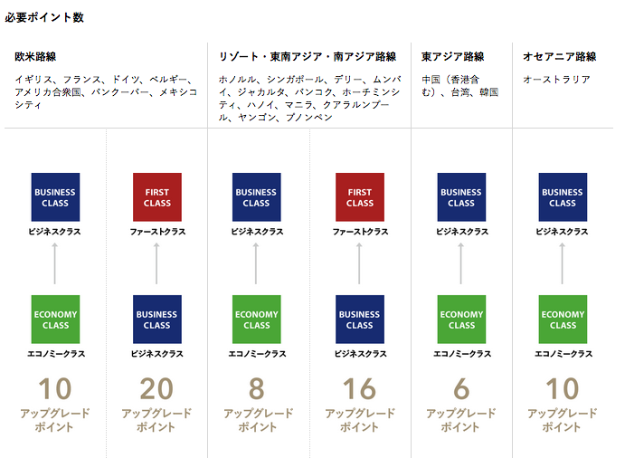 国際線の場合は、路線によって異なります。エコノミークラスからビジネスクラスへのアップグレードには、「6から10アップグレードポイント」、ビジネスクラスからファーストクラスへのアップグレードに「16から20アップグレードポイント」をそれぞれ消費します。