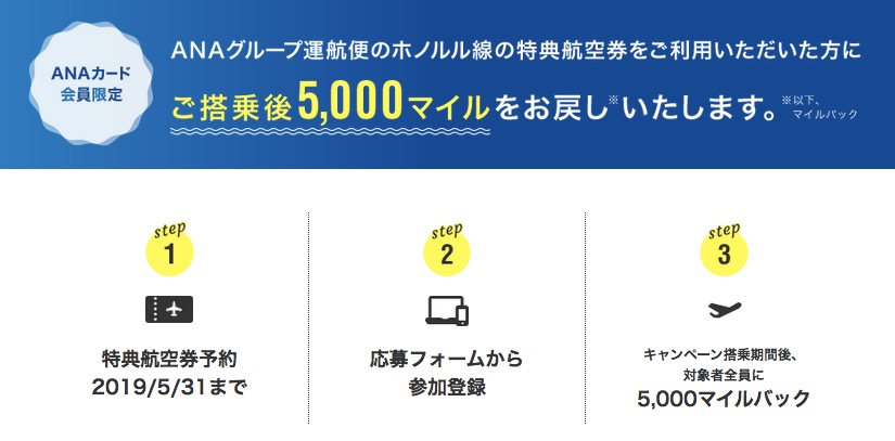 こちらのキャンペーンは、ANAグループ運行便のホノルル線の特典航空券を利用すると、搭乗後に5,000マイルが返ってくるというものです。