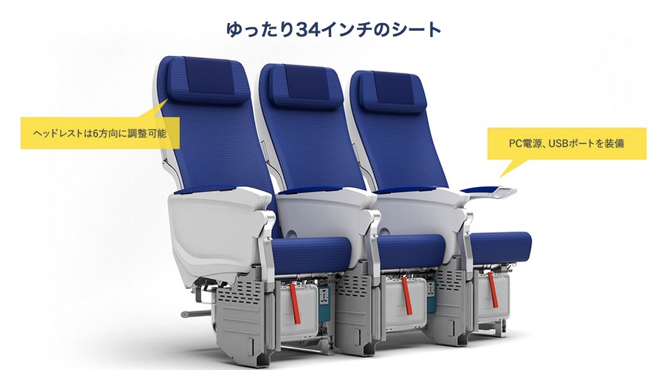エコノミークラスのイメージは以下になります。ゆったり34インチのシートになっています。