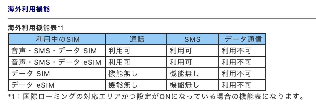 - 国際ローミングは可能だが通話とSMSのみでデータ通信不可。料金も別体系で高額