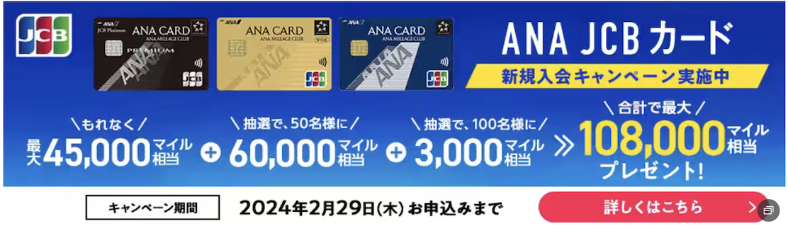 ANAカード(JCB)では2024年2月29日までの期間限定で最大108,000マイルを獲得できる入会キャンペーンを実施しています。