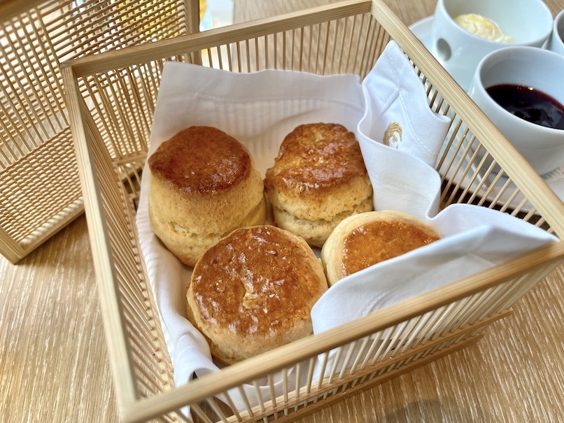ファーストドリンクを楽しんでいるとまず最初にスコーンが提供されました。スコーンはこちらの写真のように竹細工の籠に入って提供されます。和の趣が優美ですね。