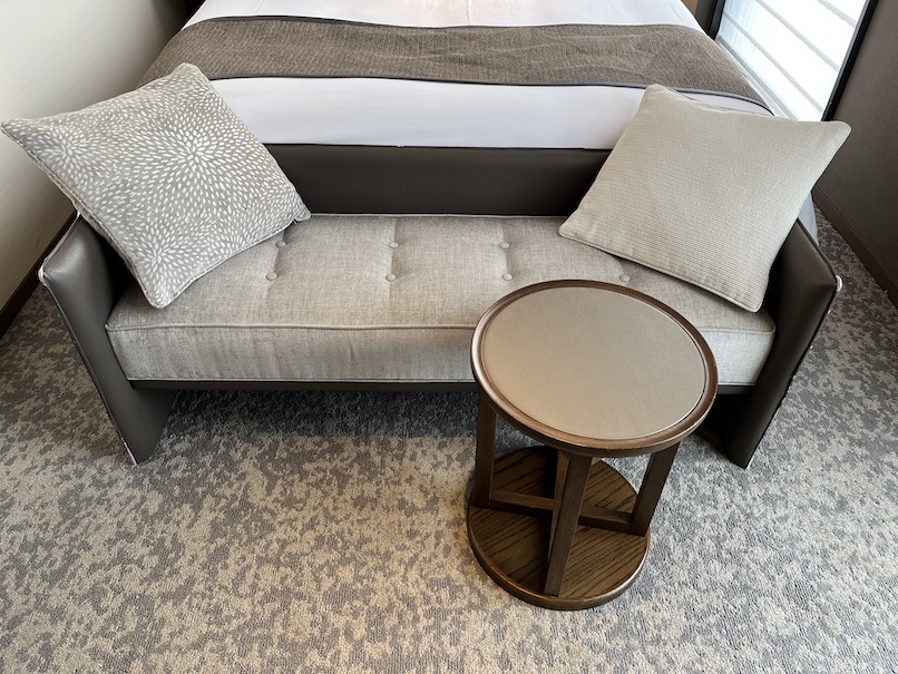 ベッドとTV台の間にはちょっとしたスペースがあり、オットマンと一体になったソファーとテーブルが用意されています。お茶や軽食はこちらのテーブルでいただくのが便利です。