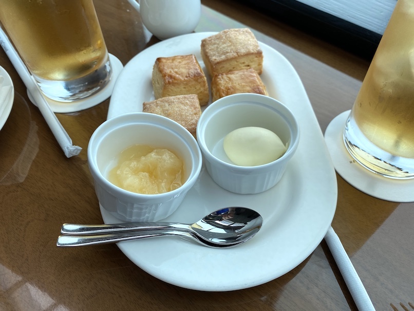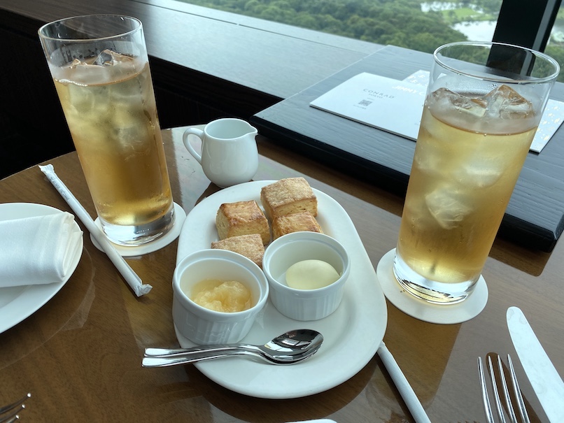 フードについては、まずはファーストドリンクとともにスコーンが提供されています。ファーストドリンクとしては「コンラッド東京オリジナルティー」をオススメされたため、そちらをアイスでいただきました。
