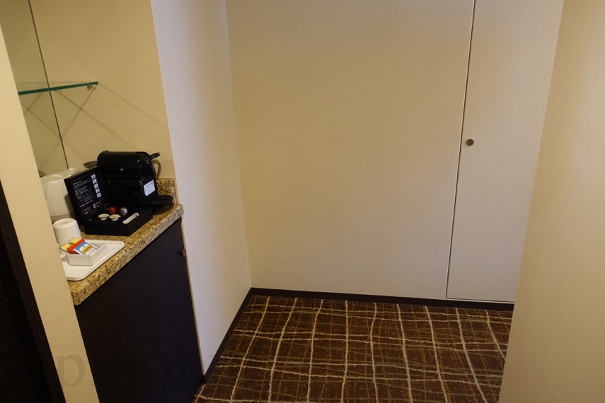 入り口の扉を開けると、左手にクローゼットとティーセットが登場します。コーナールームなので、配置がちょっと変わっていますね。