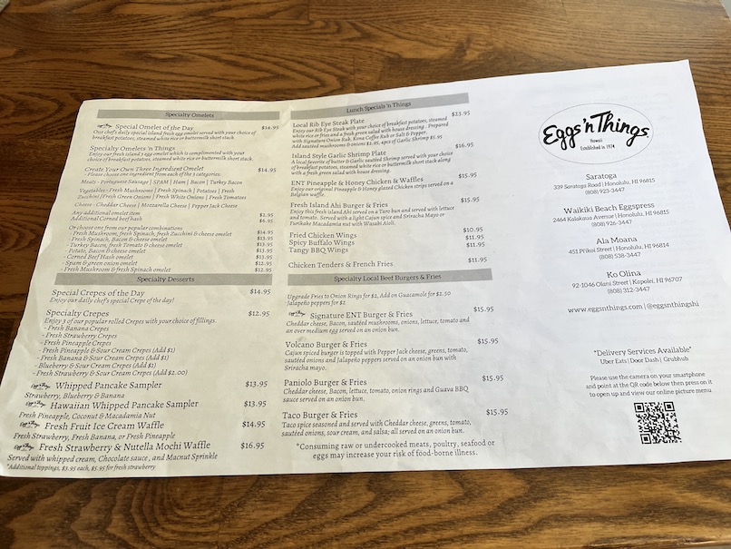 エッグスンシングス ハワイ本店(サラトガ通り)のメニューはこちらになります。2022年10月上旬に訪れた際に撮影したものです。