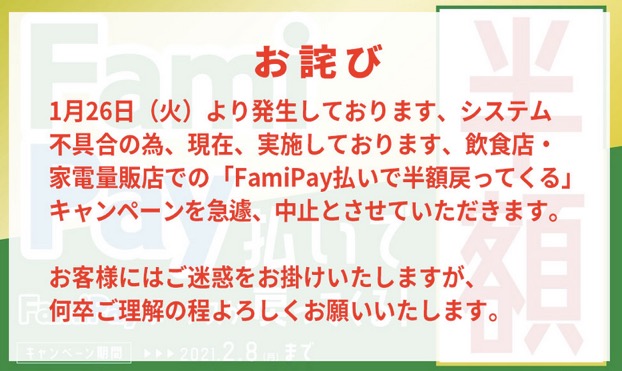こちらのキャンペーンはシステム不具合を理由に「飲食店」「家電量販店」を対象とした部分が急遽中止となりました。「ファミリーマート」分については予定どおり2021年2月1日まで実施されます。