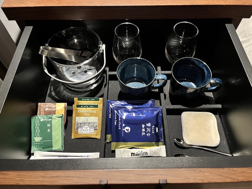 引き出しの中にはグラスとカップ、コーヒー、紅茶、日本茶(緑茶とほうじ茶)などが用意されていました。氷はアイスペールを持ってフロントにいくともらえるそうです。