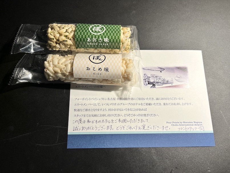 デスクの上にはウェルカムギフトが用意されていました。この日はメッセージカードと「ぽん菓子」が用意されていました。