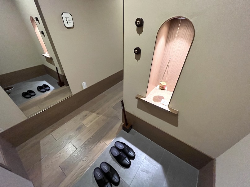 客室の扉を開けるとこんな感じで玄関スペースが用意されています。玄関には館内移動に利用できるサンダルも用意されています。