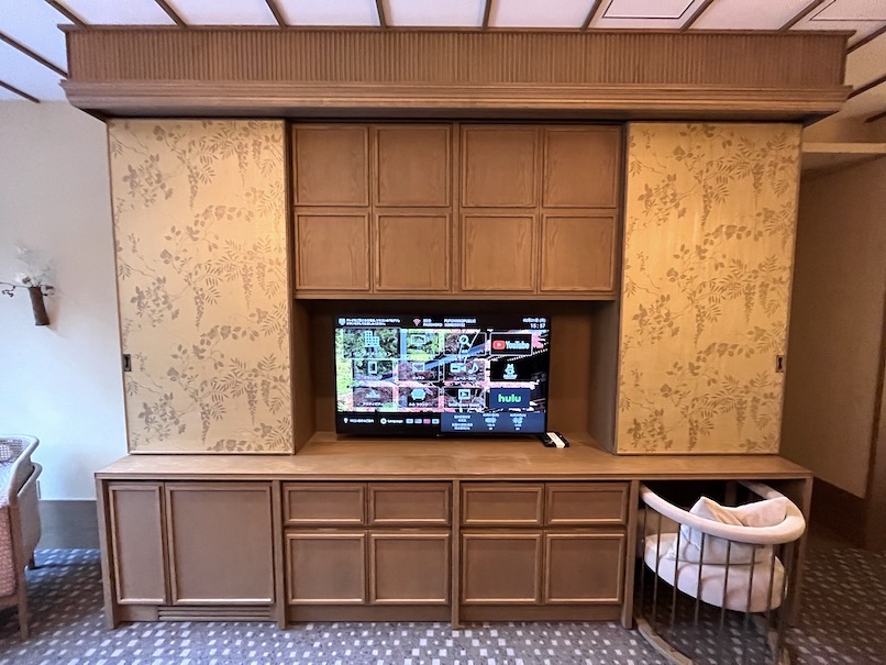 正面の扉を開けるとTVが現れます。雰囲気を重視したつくりは素晴らしいですね。TVは50インチありますが客室が広いため小さく見えます。