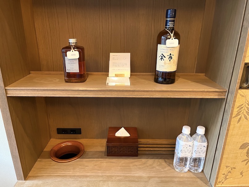飾り棚にはウィスキーと水が置いてありますが、ウィスキーは有料、水は無料となっています。