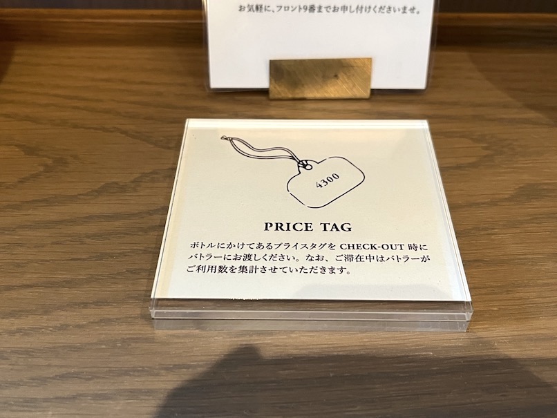 ボトルに「PRICE TAG」がかかっているものは有料、それ以外は無料という見分け方になっています。