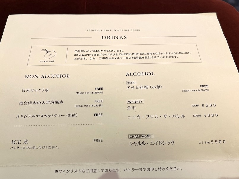 こちらはドリンク。客室に用意されていたドリンクの明細が記載されています。ビールは最初に2本は無料ですが、追加は1本につき500円必要になるため要注意です。