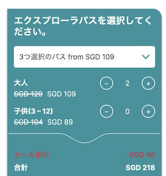 3つのアトラクションの合計価格は「145シンガポールドル」となりますので、通常価格からは「16シンガポールドル」、割引価格からは「36シンガポールドル」ほどがお得になったという計算ですね。
