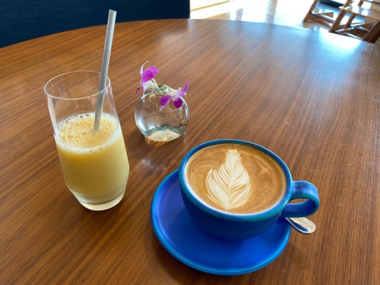 今回はスムージーとカフェラテを選択しました。ラテアートの葉っぱ模様がきれいですね。