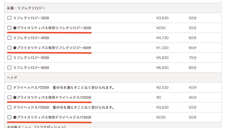 プライオリティパスを利用する場合の目安となる「3,400円」に近いマッサージメニューを抜粋すると以下のようになります。