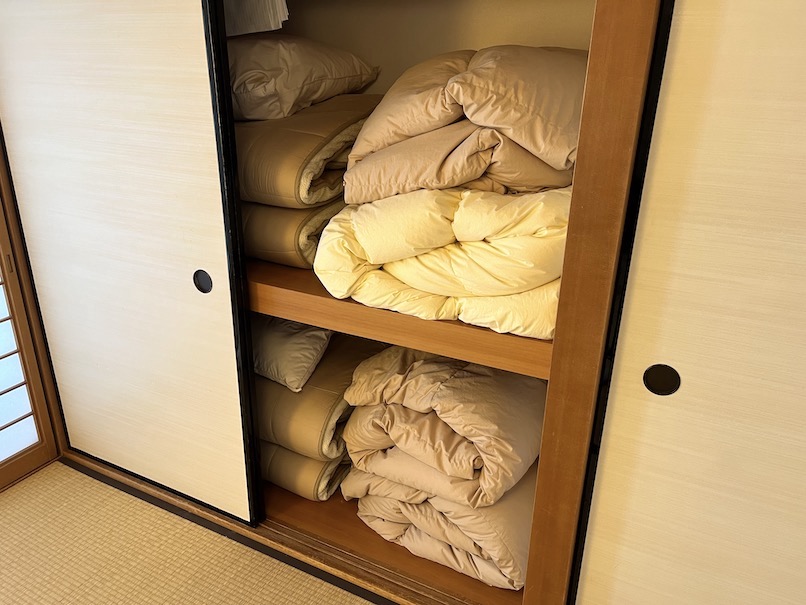 隣の押入れの中には布団や枕などが用意されてました。こちらは、夜になるとスタッフにセッティングしていただくことができます。