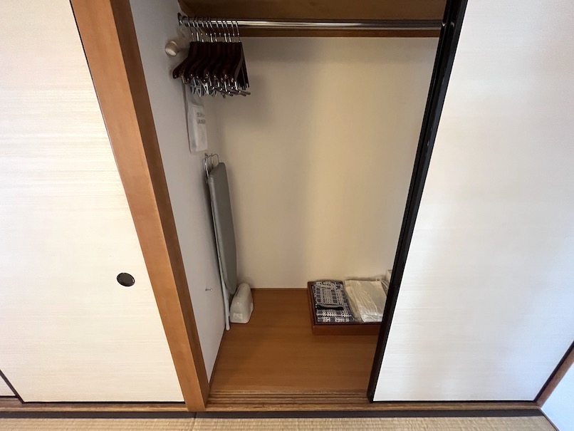 寝室の押入れの中にはクローゼットが用意されています。中には洋室同様、パイプハンガーが用意されています。アイロンとアイロン台もありますね。