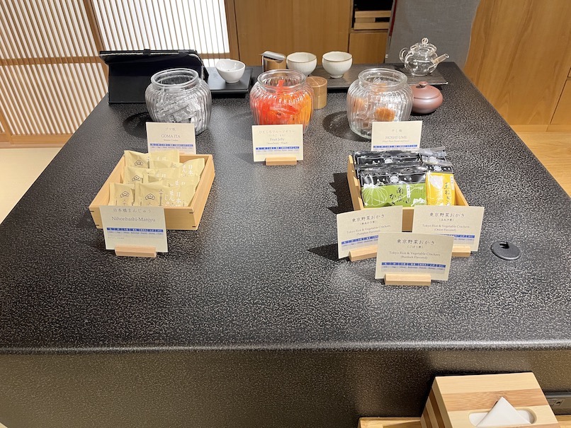 チェックインのタイミングでは、ウェルカムドリンクとして「ほうじ茶」とお茶菓子が提供されました。美味しいお茶とお菓子をいただきながら座ってチェックインできるのは嬉しいですね。