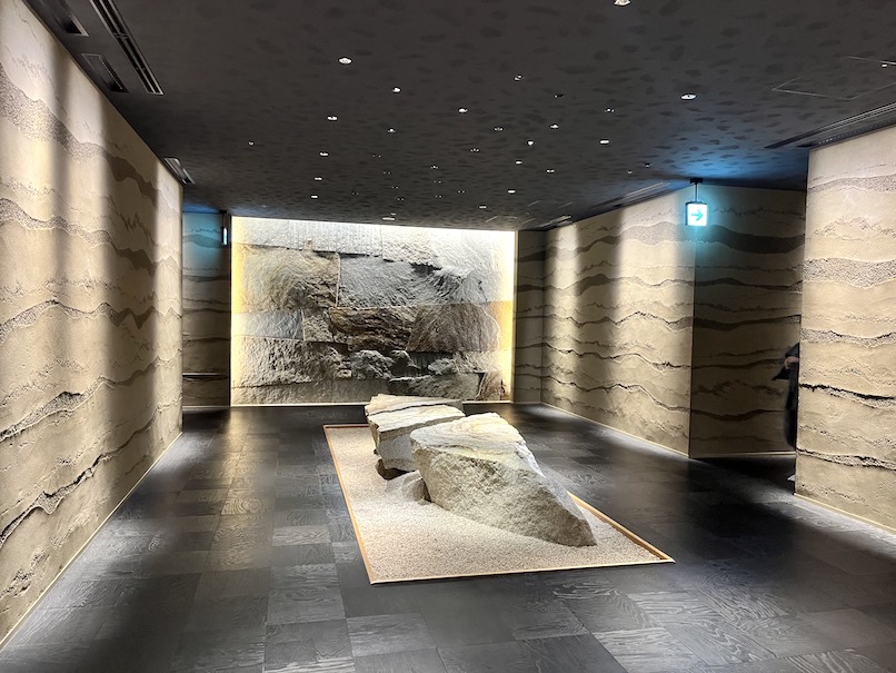 こちらのホールは中央と壁にあしわられた「岩」が印象的な空間になっていますね。ロビーや客室フロアとは間違った意味で非日常感にあふれています。
