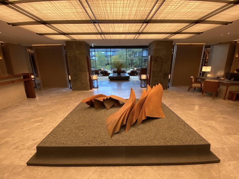 正面エントランスから中に入るとエントランスホールがあります。こちらのホールの中心には「風」をテーマにしたオブジェが飾られており目を引きます。こちらには、ホテル内に良い気を運ぶようにという意味があるそうです。