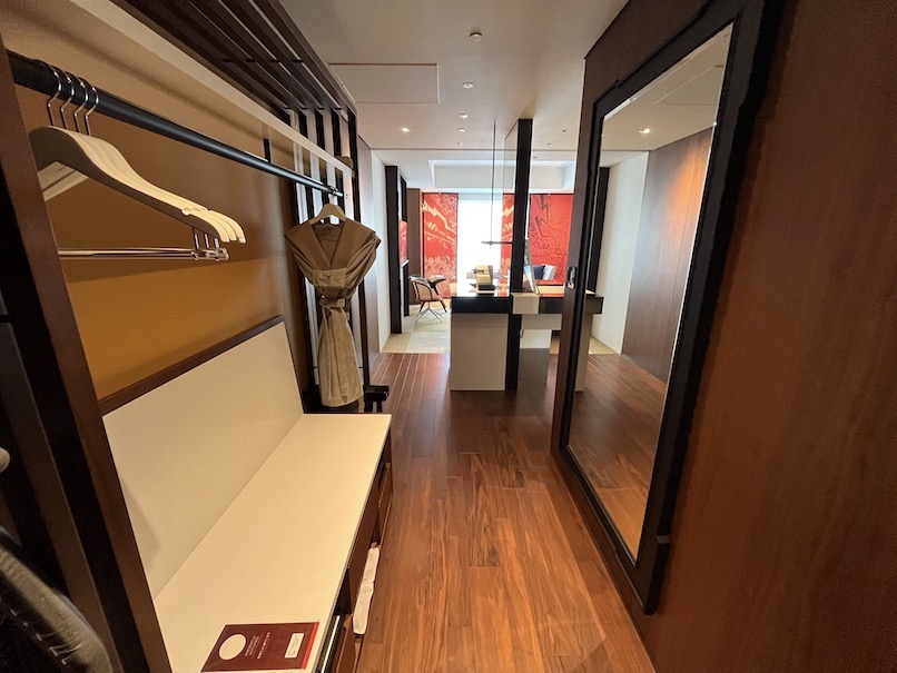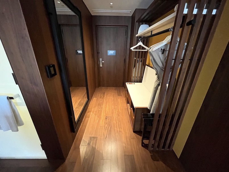 客室の扉を開けるとこんな感じになっています。ちょっとした玄関スペースがあり、左手にクローゼット、右手にバスルーム、正面奥にベッドルームという配置になっています。