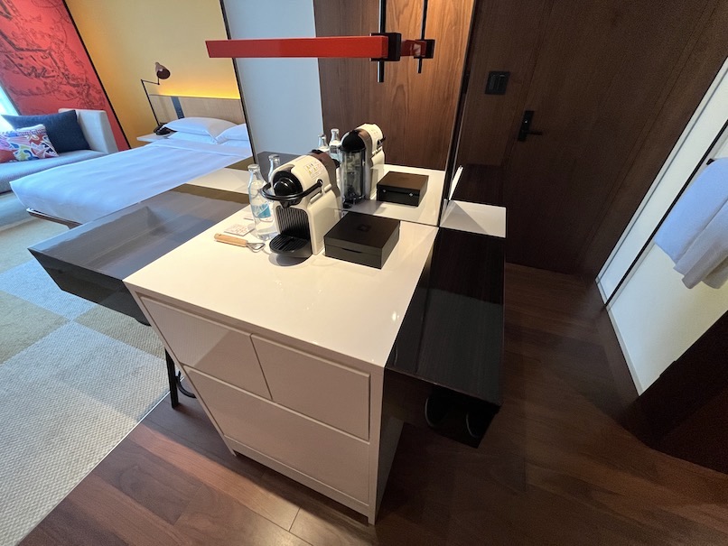 まずこちら側はミニバーになっています。カウンターの上にはコーヒーメーカーと無料の水は配置されています。