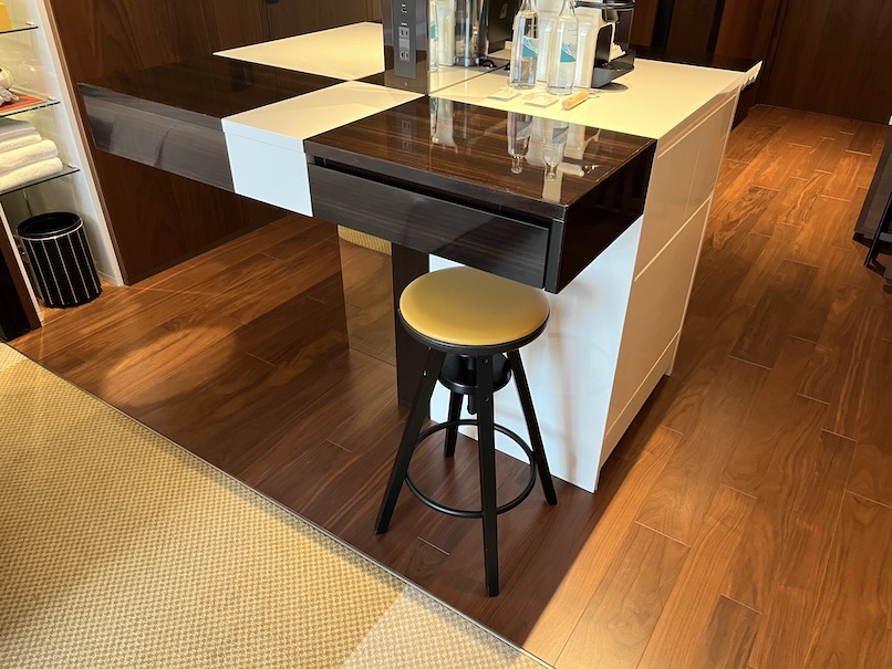 バスルームとベッドルームの中間地点にはカウンターが用意されています。このカウンターは、半分がミニバー、半分が洗面台となっています。スペースを有効に活用していて機能的です。