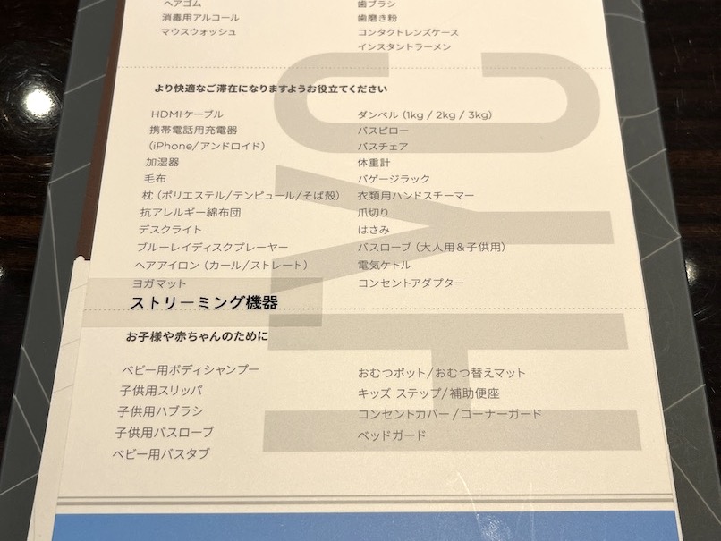 こちらの宿泊ガイドには、追加アメニティーや貸出品がリストされているため要チェックです。まずこちらは追加アメニティーですね。