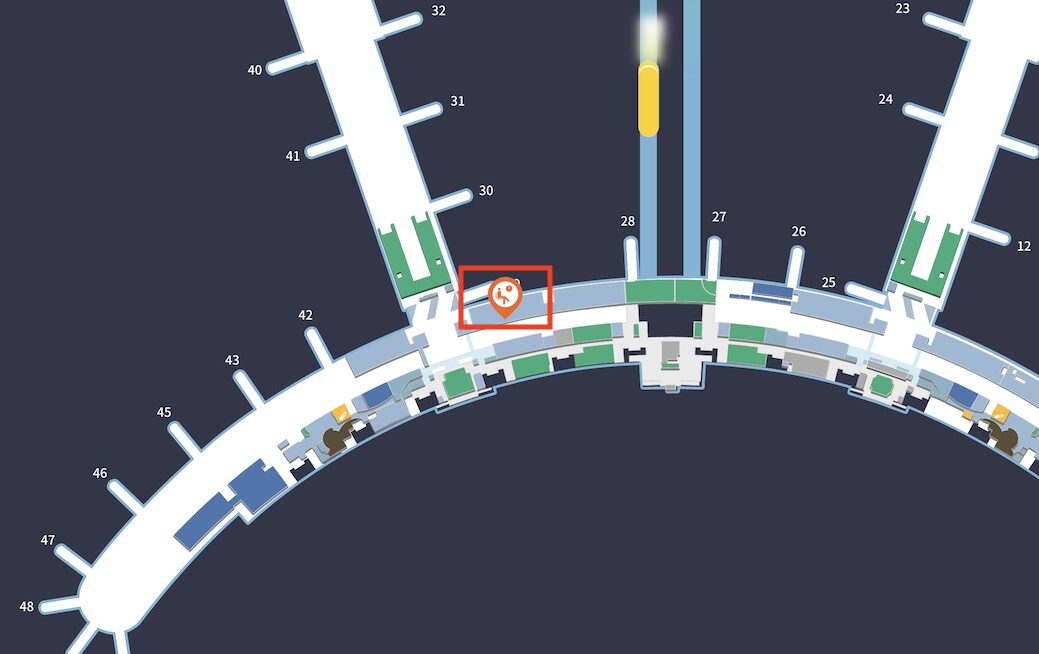 空港マップ上に場所をマッピングすると以下のようになります。近くにはトランジットカウンターもあります。