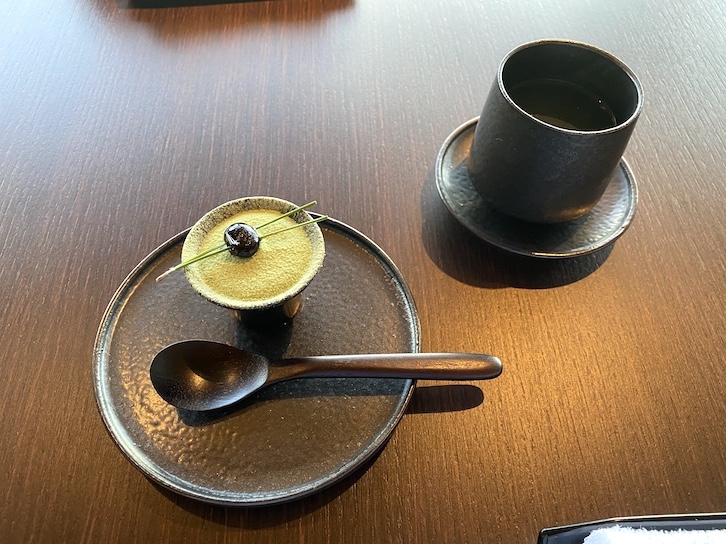 ウェルカムドリンクは日本茶で、スイーツは抹茶ムースになっていました。こちらのスイーツはシェフが和ラウンジ用に特別に考案したもので、ここでしかいただけないものだそうです。
