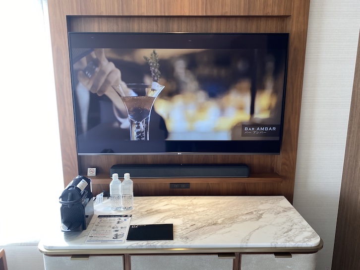 こちらの「エグゼクティブフロア」は2020年に改装が行われており、設備も最新式にアップグレードされています。TVはLG製の大型の4Kテレビで迫力があります。SONY製のサウンドバーも搭載されており、音質も良好です。