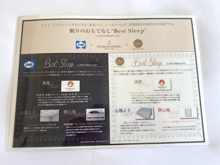 ベッドはインターコンチネンタル東京ベイが「シーリー」と「昭和西川」ともに共同開発した「BEST SLEEP」のベッドとなっており、寝心地抜群です。