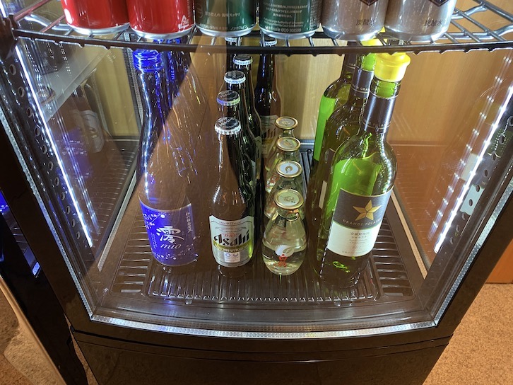 冷蔵庫の中には、ビールと日本酒、白ワインが用意されていました。ビールは「アサヒスーパードライ」、日本酒は「白鶴」とスパークリング清酒の「澪(MIO)」、白ワインは「安曇野池田シャルドネ」となっていました。