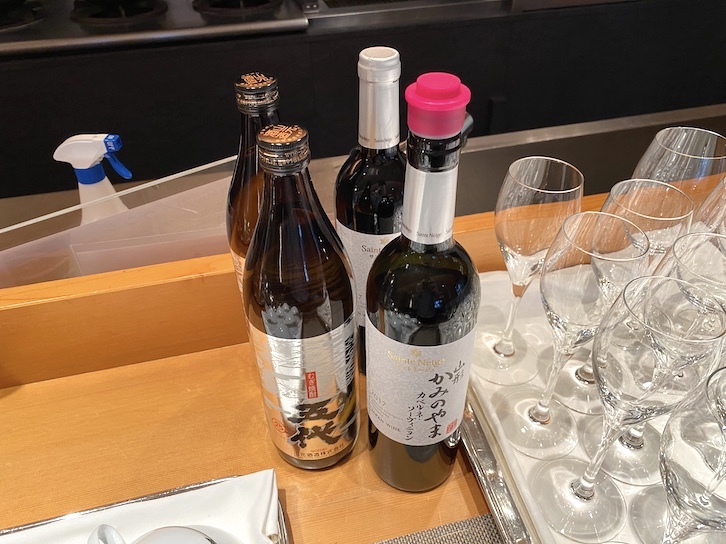 続いてはドリンクの品揃えです。カウンターの上に用意されていたのは、焼酎と赤ワインです。焼酎は「むぎ焼酎 五代」、赤ワインは「山形かみのやま カベルネ・ソーヴィニヨン」となっていました。