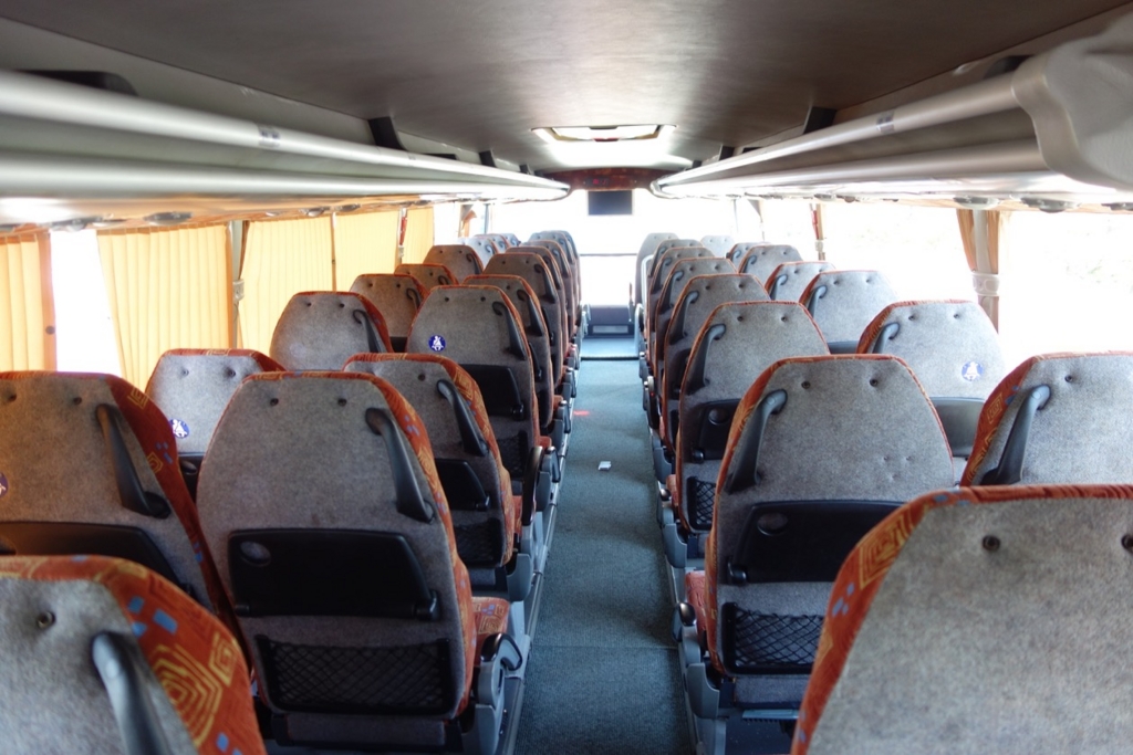バスの中はこんな感じです。なかなか綺麗なバスでした。この写真はみんなが降りてから撮影したので誰も写っていませんが、出発の際には、空席がまったくないほど超満員でした。