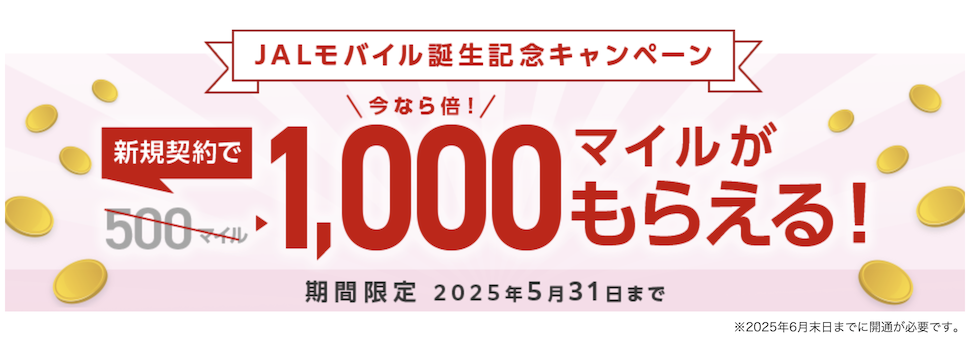 これはJALモバイルの新規契約と条件達成でもれなく500マイルが貰えるというものです。キャンペーン期間は2025年7月1日から8月31日までとなっています。