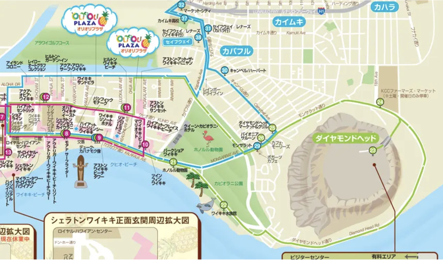 ダイヤモンドヘッドルートの停留所は以下になります。