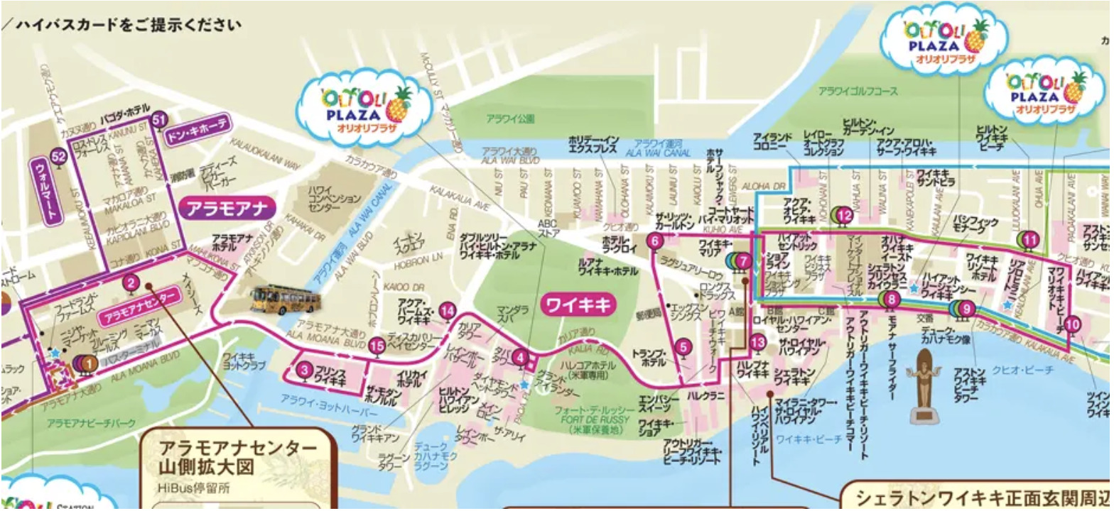 ハワイのトロリーバスとしては、同じようなルートを運行するワイキキトロリーの「ピンクライン」があります。こちらはJCBカード提示で無料で利用することができます。