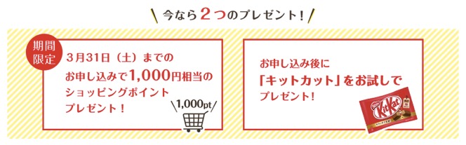 1,000円相当のショッピングポイントのプレゼントは、3月31日までの期間限定になりますのでご注意ください。