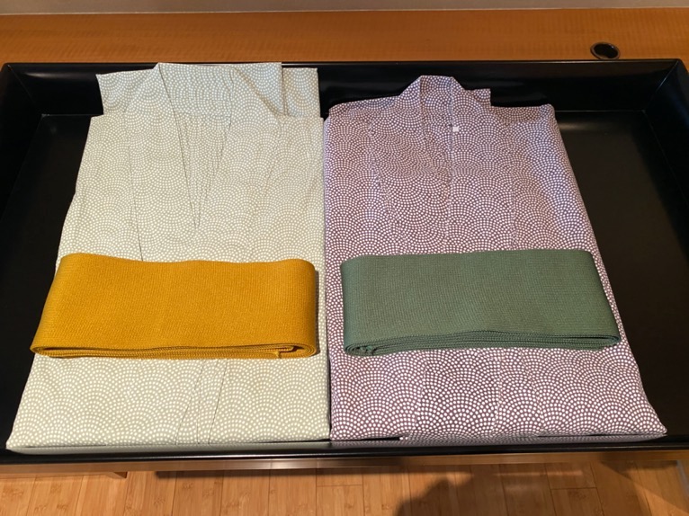 最後に、その他細々した設備や備品などをご紹介したいと思います。客室内には、浴衣が用意されています。男性用と女性用の2サイズで、和モダンな雰囲気とマッチしていますね。
