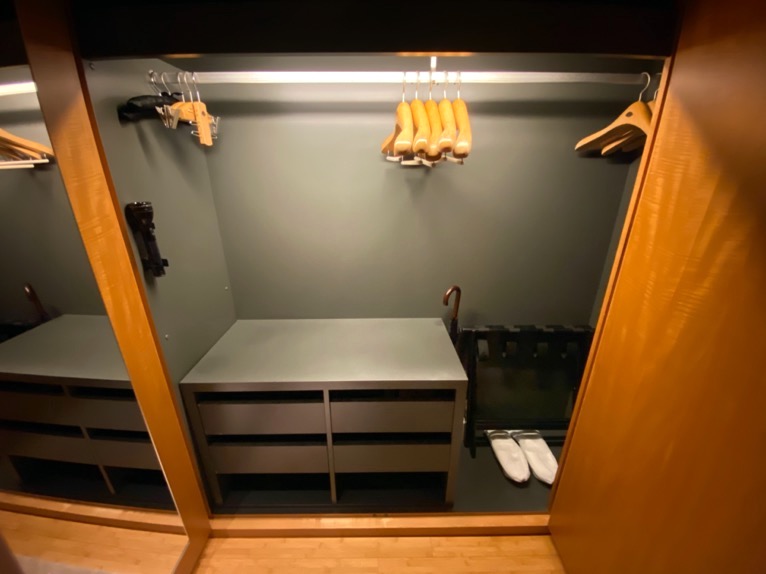 左手の扉を開けると中はこんな感じです。ハンガーの他、傘やスリッパなどが用意されています。