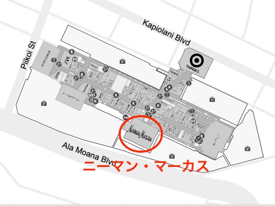 ニーマン・マーカス(Neiman Marcus)は、アラモアナセンターの南に位置しています。