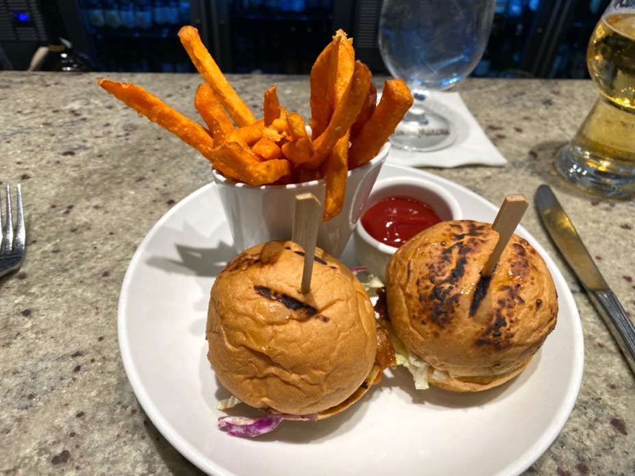 続いては、こちらが「ポークベリーのハンバーガー(Pork Belly Sliders)」です。小さめサイズのハンバーガーが2つに、ポテトが付け合わせとしてセットになっています。