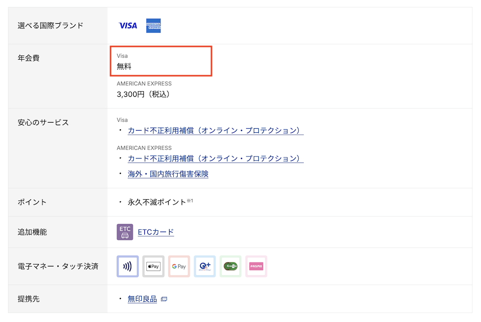国際ブランドは「VISA」と「AMEX」から選択することができ、VISAの場合は年会費無料となっています。